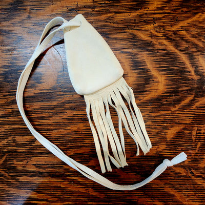 A tiny fetish carving, a bit of tobacco, cedar or sage will fit in this small pouch made from white leather. It opens and closes with a strand of white leather. The long leather strap can be used to wear it, tie it to something else, or make it much shorter.