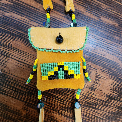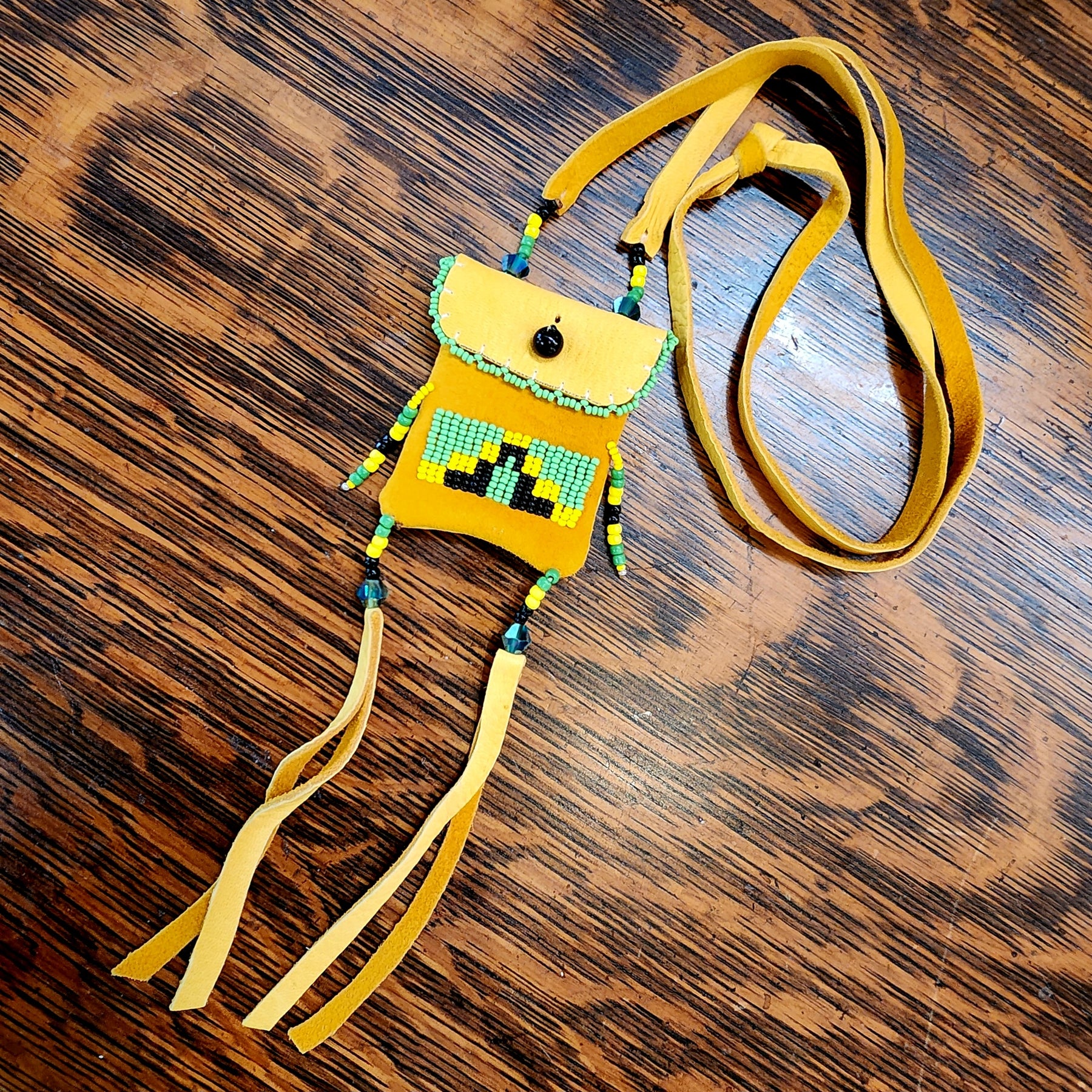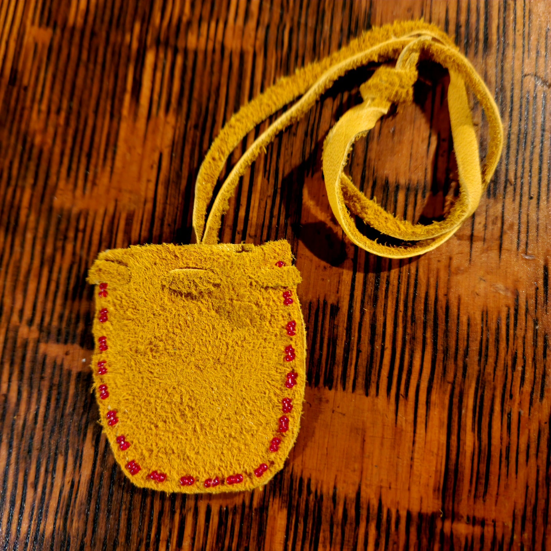 A tiny fetish carving, a bit of tobacco, cedar or sage will fit in this small pouch made from white leather. It opens and closes with a strand of white leather. The long leather strap can be used to wear it, tie it to something else, or make it much shorter.