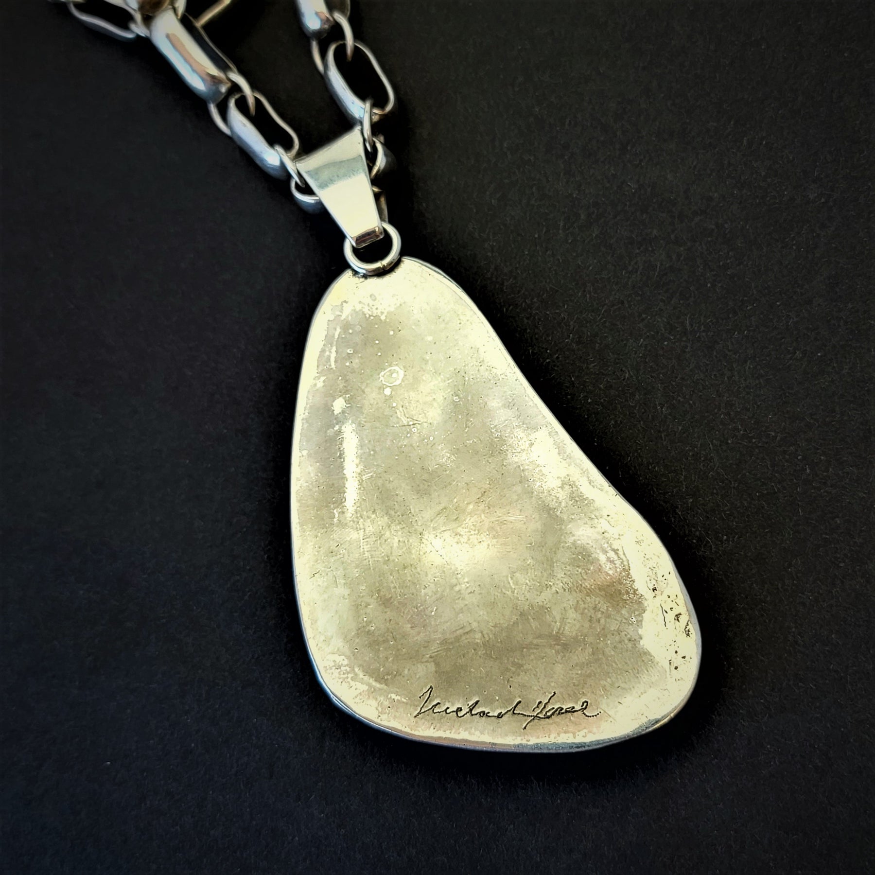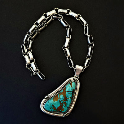 This fabulous pendant with a large natural Carico Lake turquoise was made by award-winning Yaqui jeweler Michael Horse.  The sterling silver setting is beautiful with twisted wire around the bezel and delicate cut-outs around the outside.  The handmade sterling silver heavy duty chain comes with it and is 26" long.