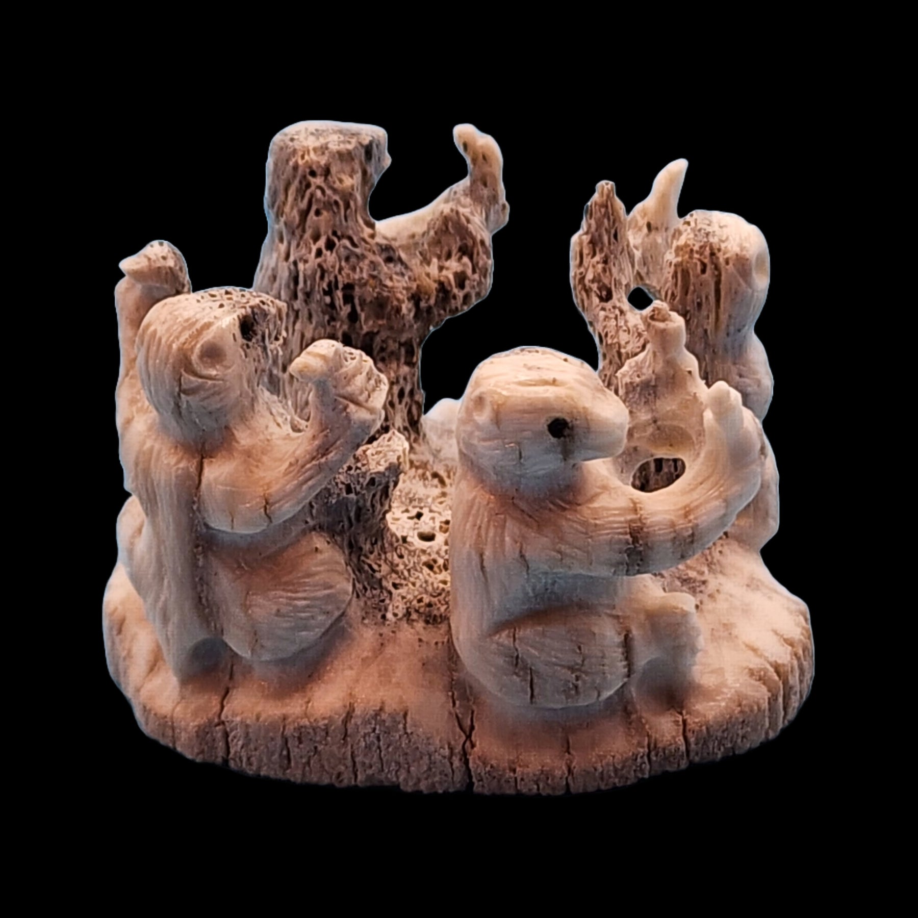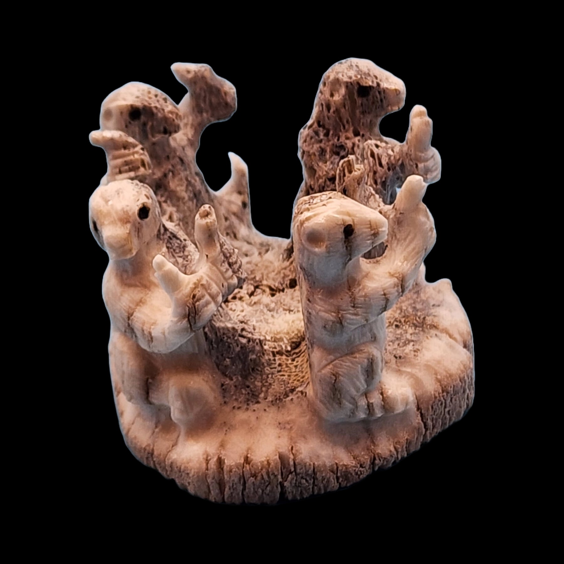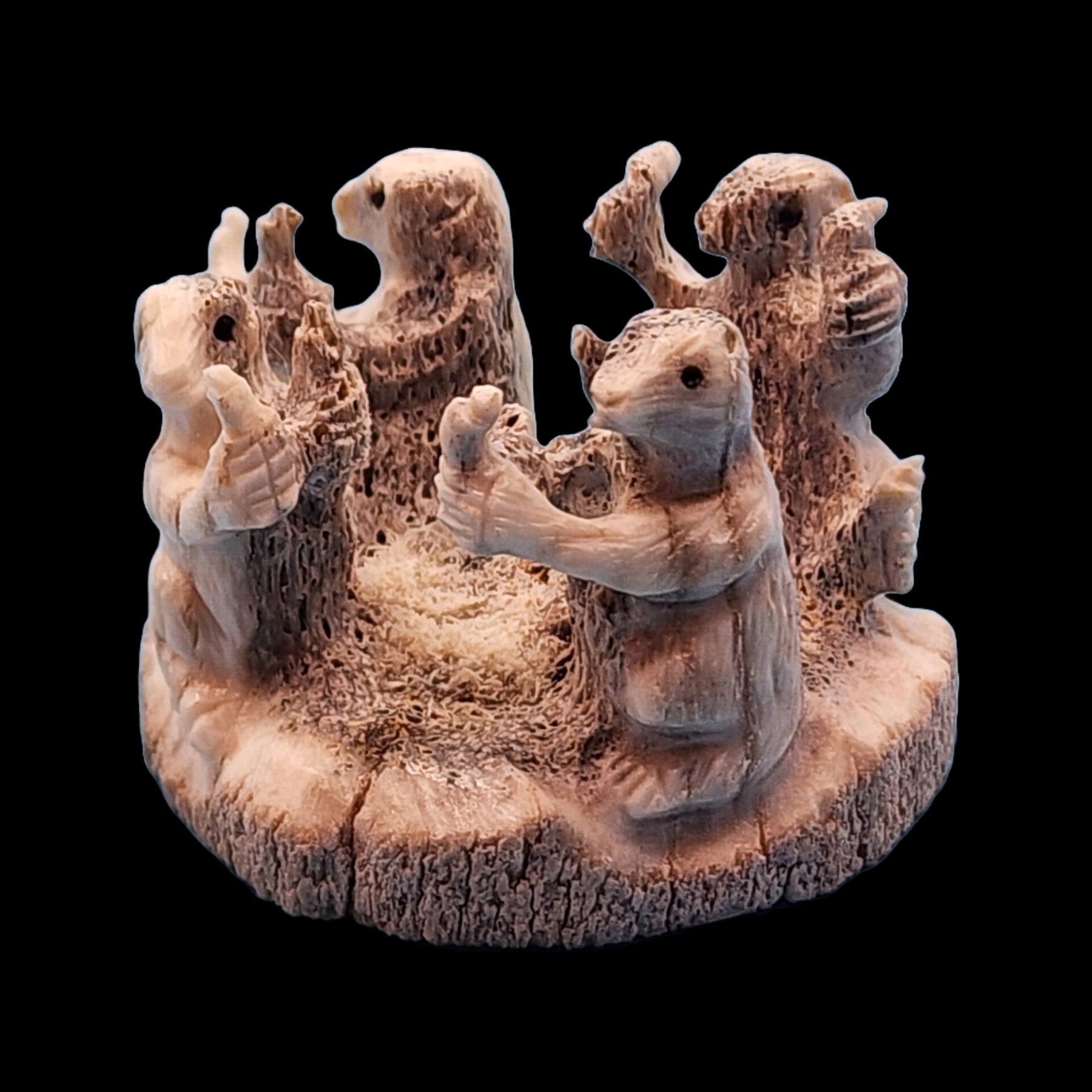 Four joyous meerkats are holding what may be little birds in each hand.  Chris Peina carved them from antler and inlaid jet eyes.  Their faces, hands, and legs are detailed.